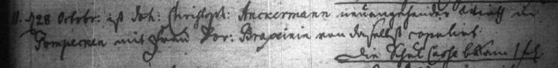 HENRICH FRIELING ein Reuter befreyet sich an ANNEN CATHRINEN MOHRS zu Heiligenlohe, auff ihre Beybauerey dabey weder Land noch Wiesenwachß, 2 Pferde, 6 Beester, 3 schweine, keine schuldt, dagegen er die Stette verbeßert mit 50 thlr. 2 thlr |