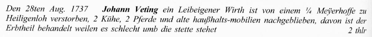 HENRICH FRIELING ein Reuter befreyet sich an ANNEN CATHRINEN MOHRS zu Heiligenlohe, auff ihre Beybauerey dabey weder Land noch Wiesenwachß, 2 Pferde, 6 Beester, 3 schweine, keine schuldt, dagegen er die Stette verbeßert mit 50 thlr. 2 thlr |